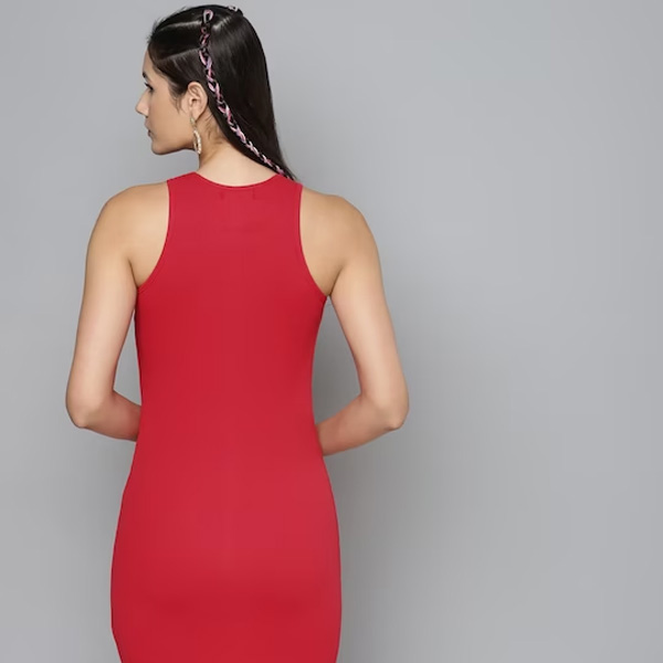 Red solid knitted bodycon dress, has a round neck, sleeveless, and straight hem with a front slit